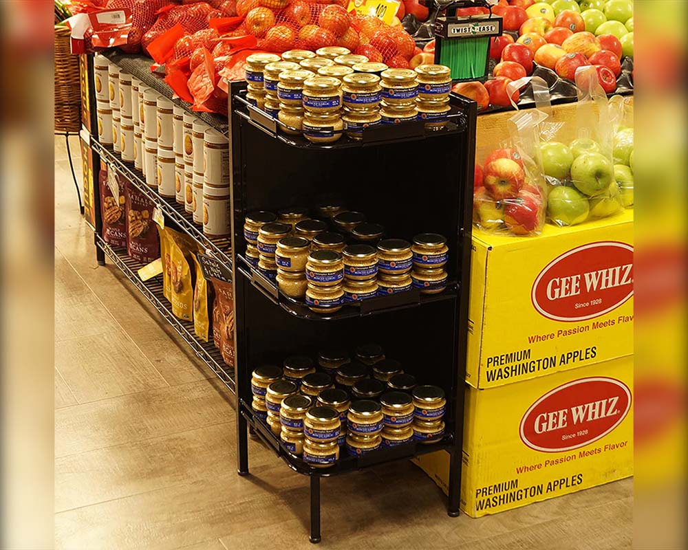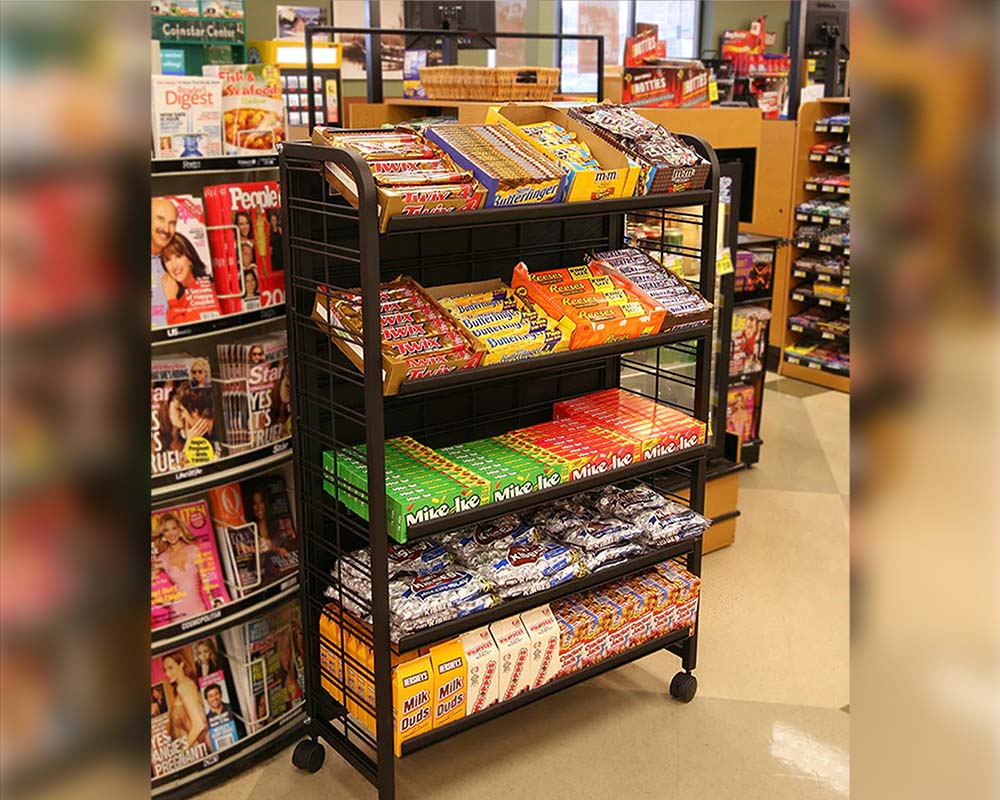 Our Gondola displays come in many shapes and sizes allowing for the creation of your perfect floor plan. We also offer variety in our shelving options, such as: flat, angled, hooked, wire, or sheet metal shelving. Perfect for bakery items, snacks, candy, and wine.