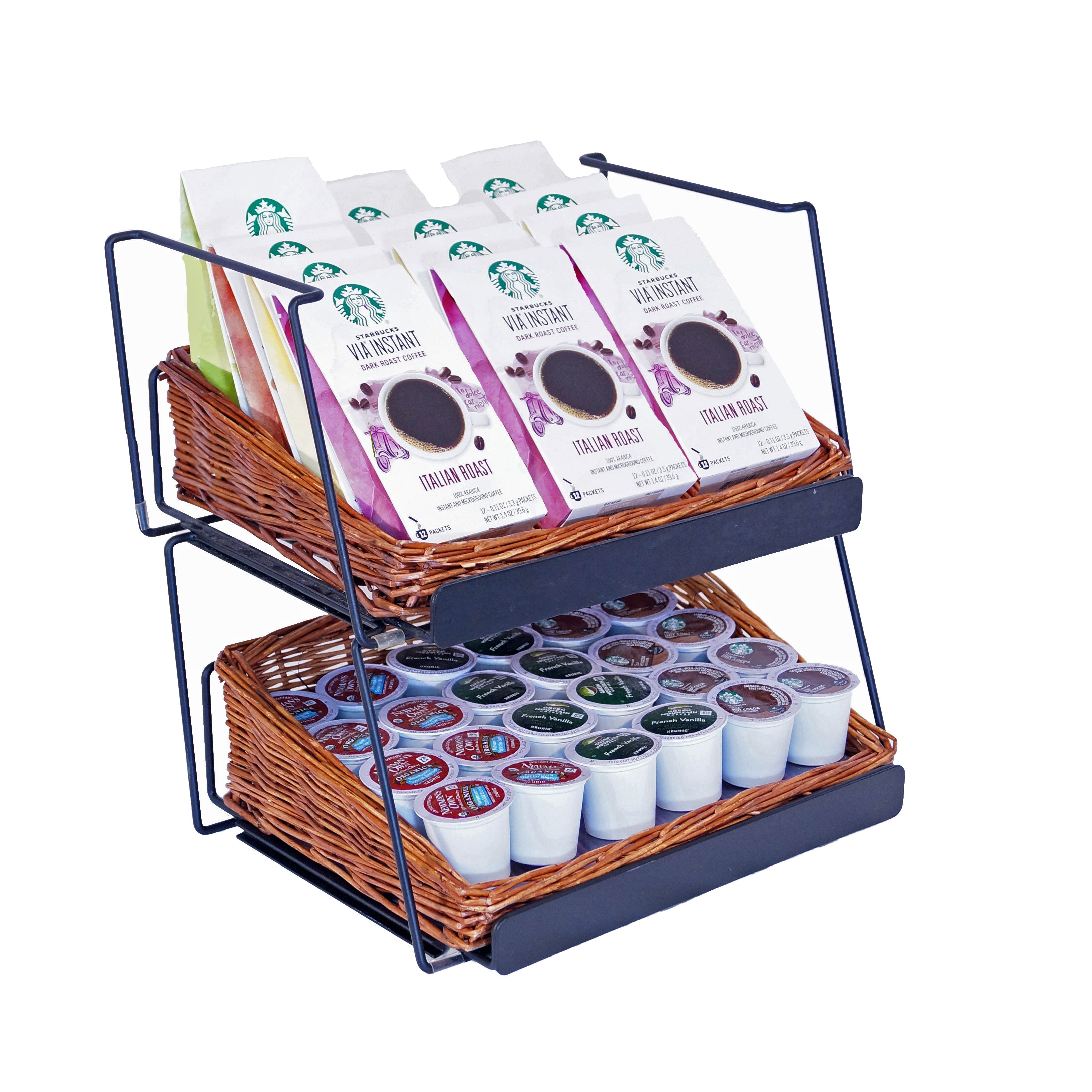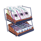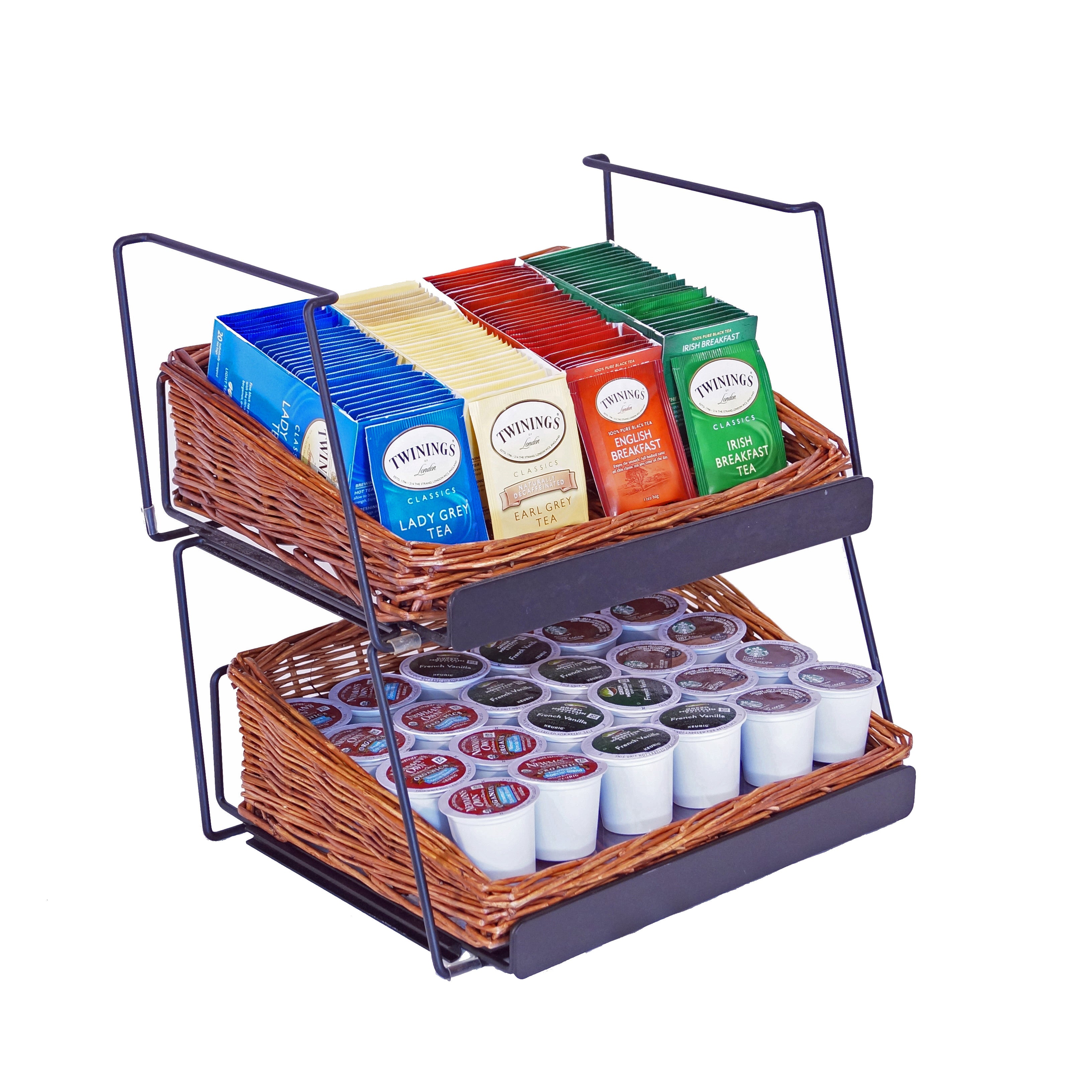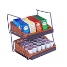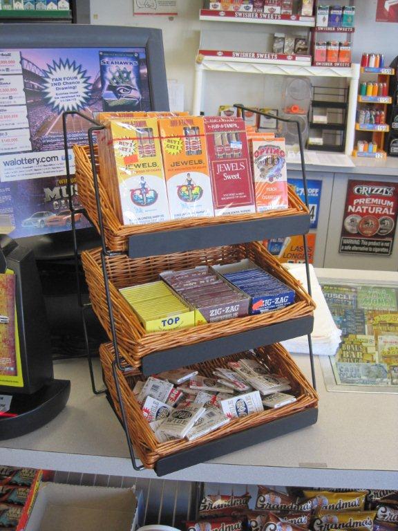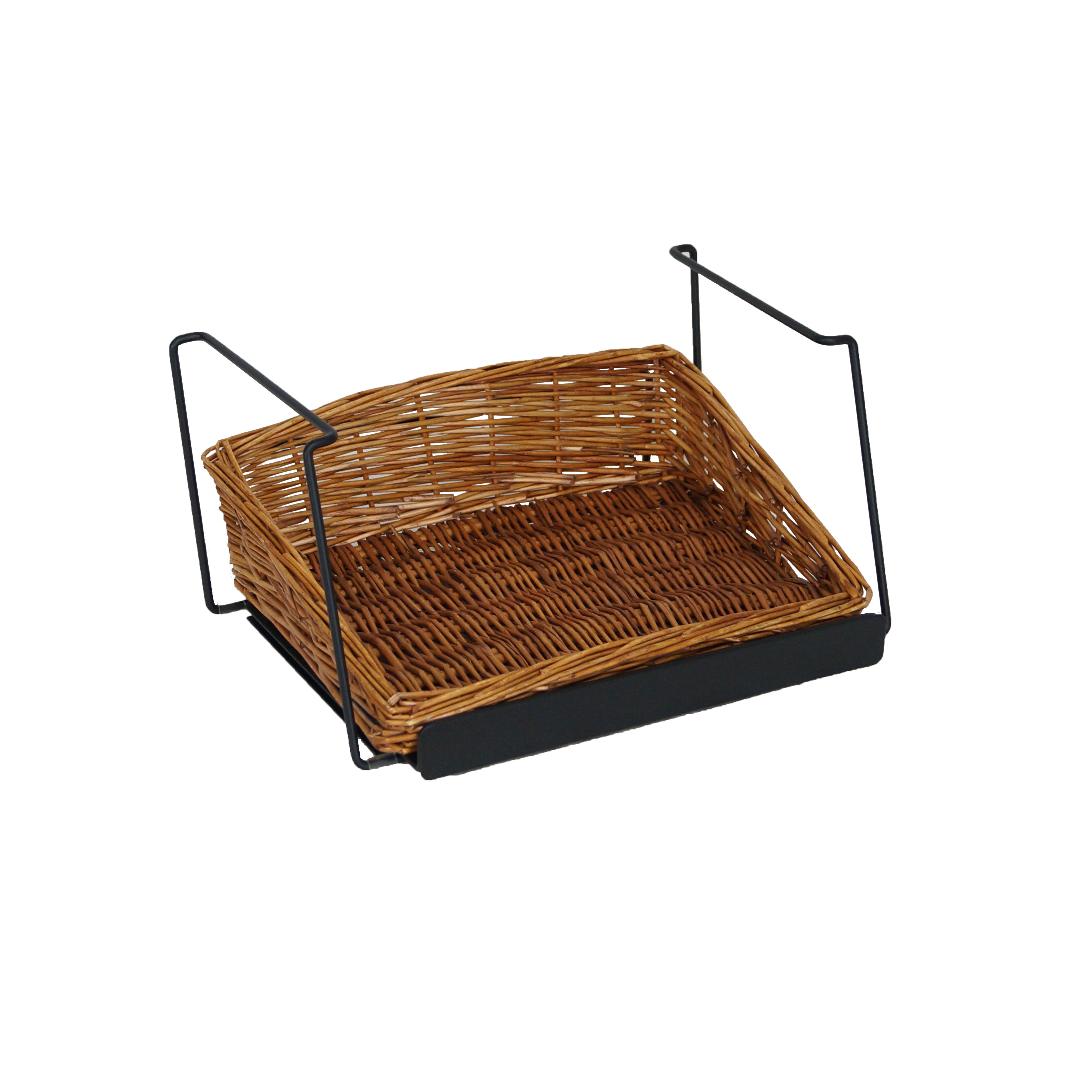 This modular display adds vertical merchandising opportunities to limited counter space. Willow baskets add warmth and rustic charm, while sturdy wire framing supports your products.This is our 3-tier rectangular willow basket counter display. This display comes complete with 3 rectangular willow baskets and 3 modular shelves.