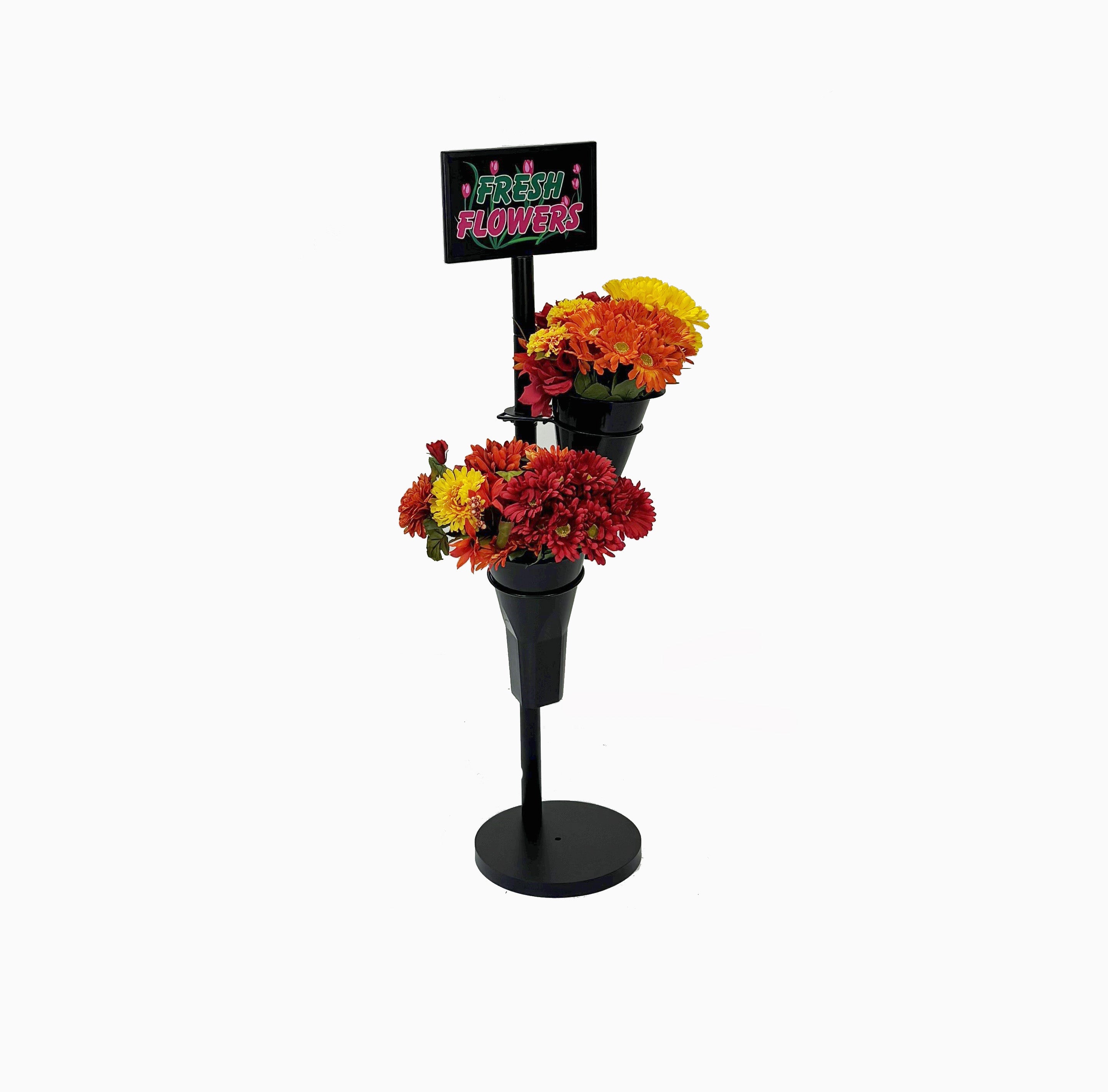 • Place one of our 42” 1, 2, or 3 Vase Floral Displays at the checkout stand.  This Floral Display takes up very little floor space, leaving you able to show off some color while enticing your customers to make a last-minute purchase of a fresh or artificial bouquet of flowers.