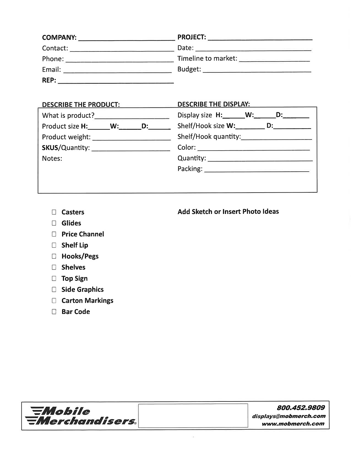 Begin your design with the form below. Print out the form and contact your sales representative at Mobile Merchandisers.