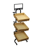This display was made to show off products with a warm and inviting rustic aesthetic. It features a strong metal backframe with wooden crate fittings and a sign frame.