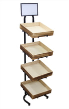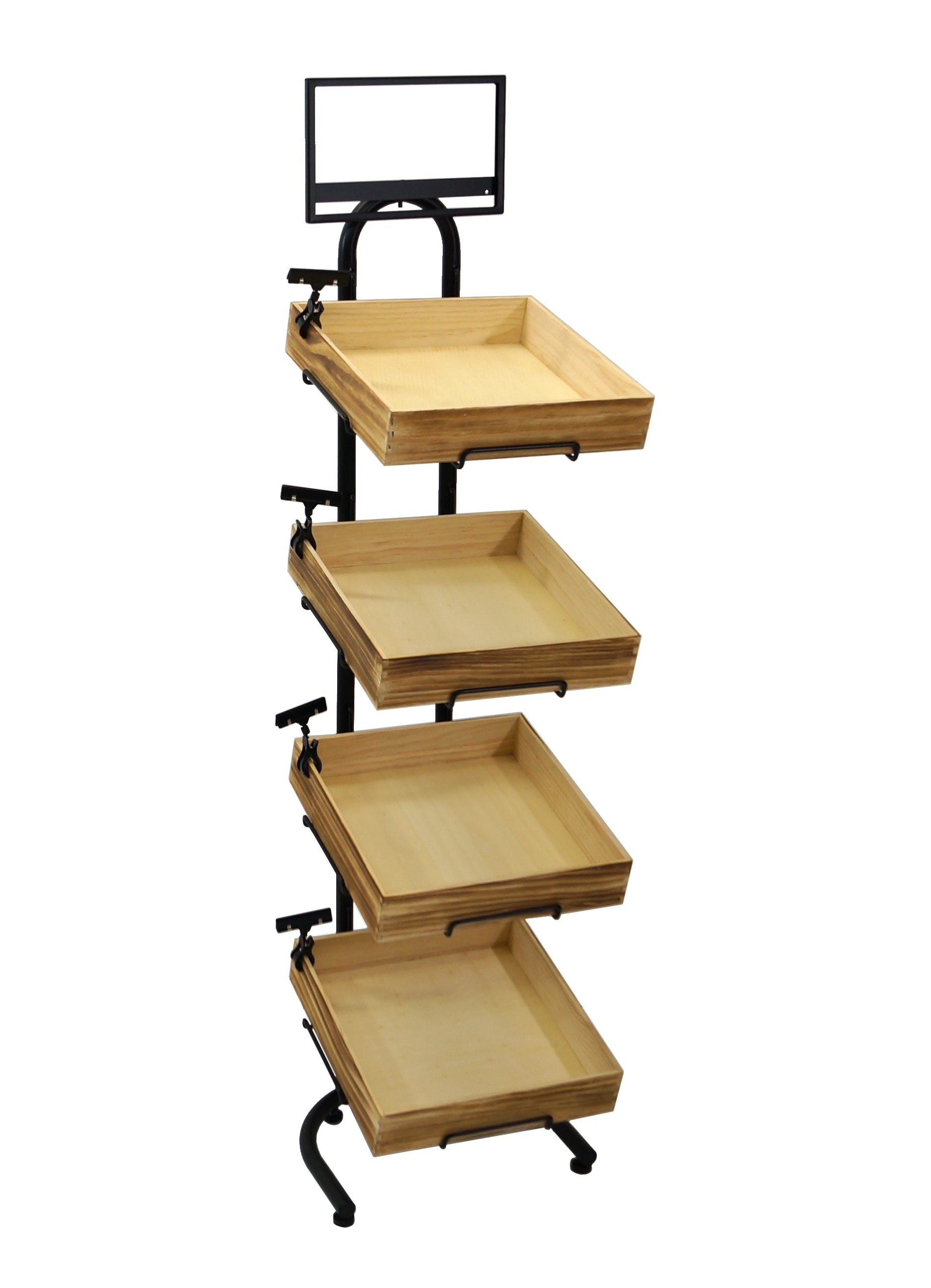 This display was made to show off products with a warm and inviting rustic aesthetic. It features a strong metal backframe with wooden crate fittings and a sign frame.