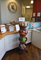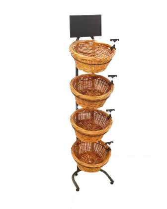 This is our top selling 4-tier willow basket floor display. It comes equipped with a top mounted sign frame, 4 round willow baskets, and 4 sign clips.
