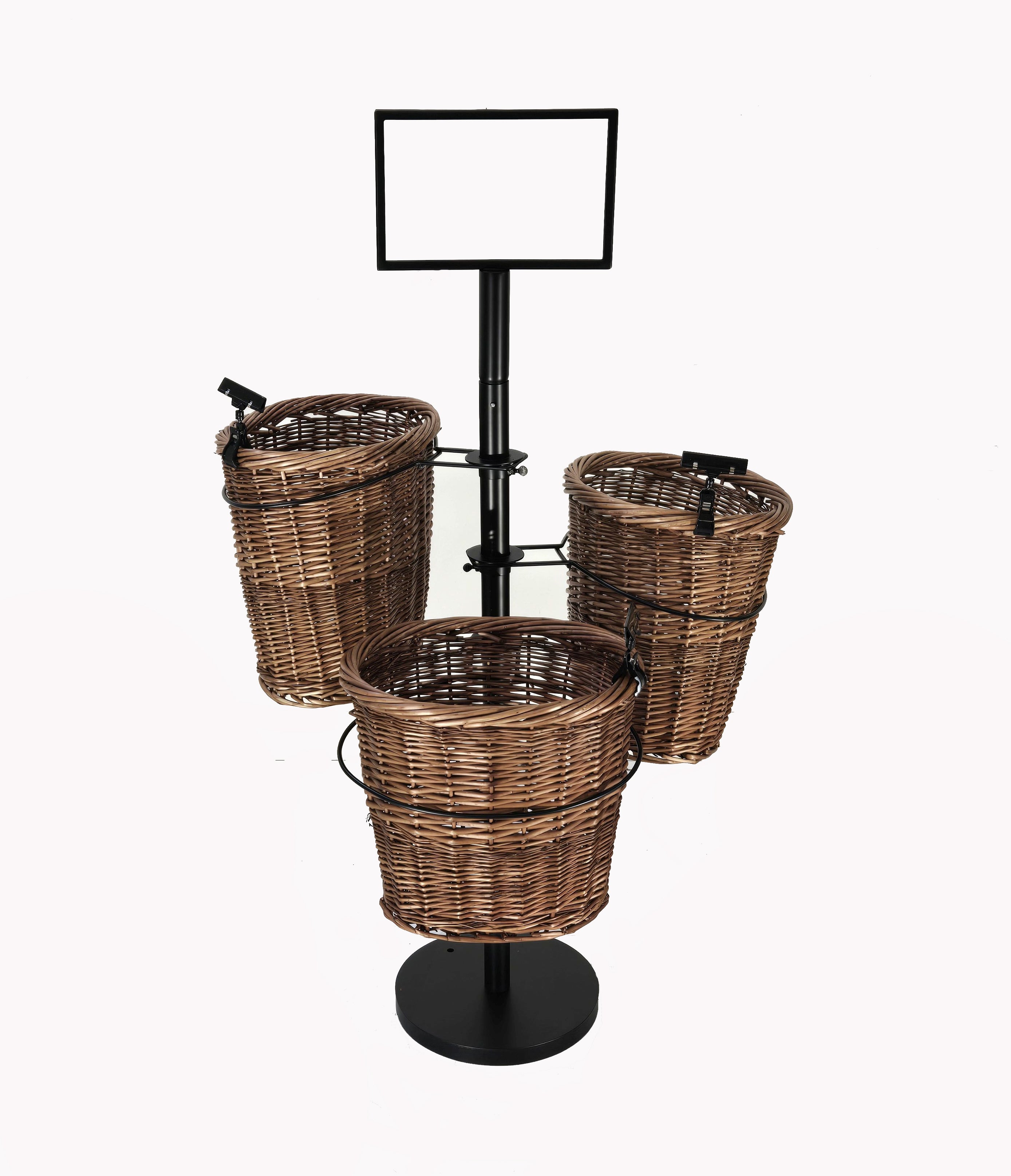 This is our triple tall willow basket stand. This display comes complete with one metal base, three tall willow baskets, and one mountable sign frame.