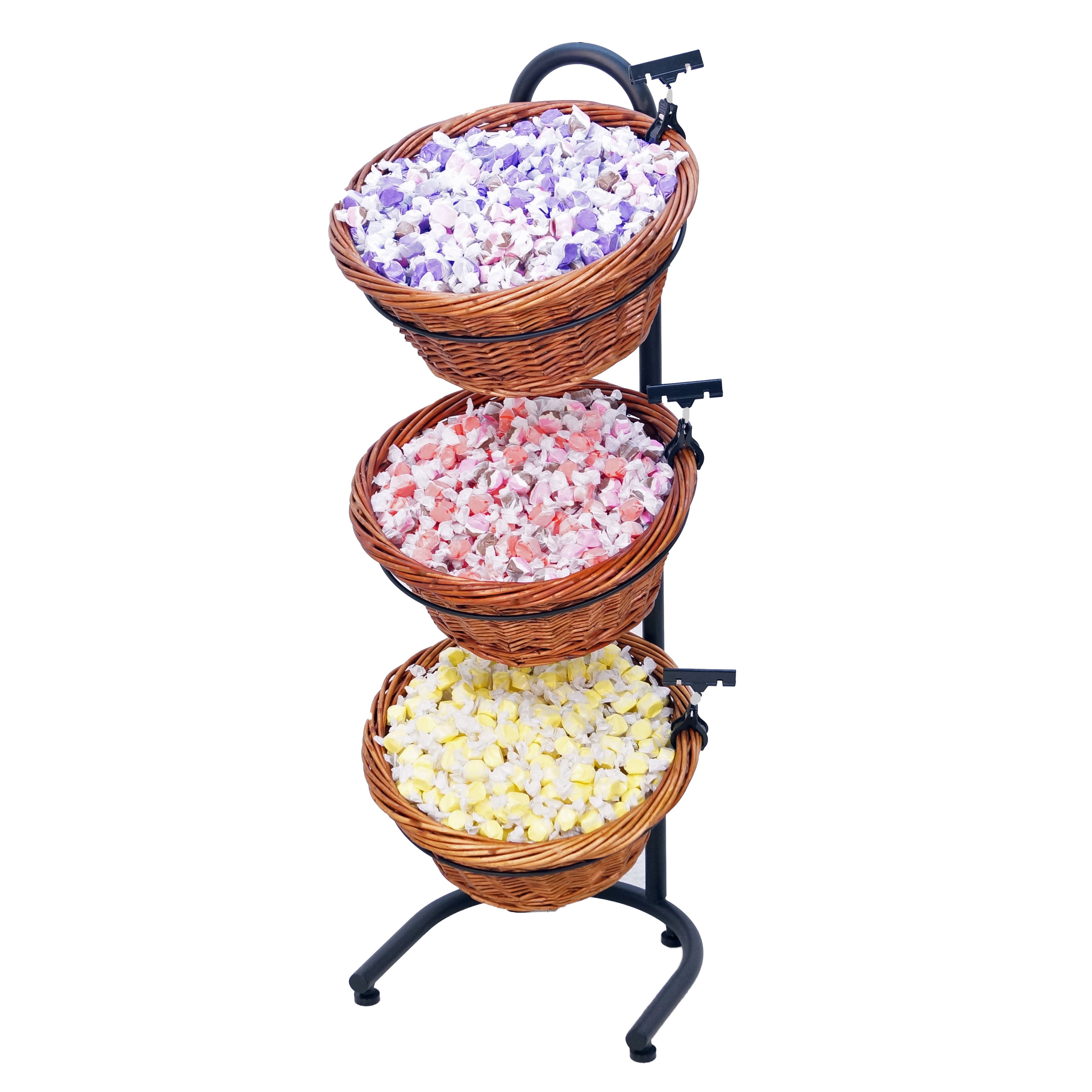 This is our 3-tier round willow basket display. Display comes complete with 3 round willow baskets, 3 sign clips, and a top mounted sign frame.
