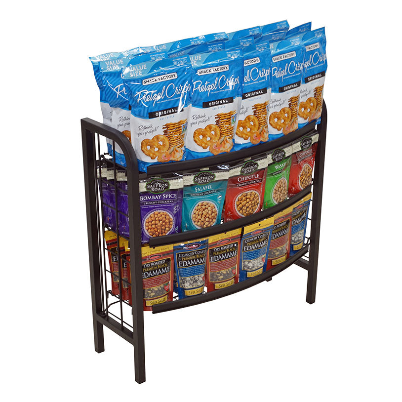 This multi-use wire display is a great option for bakery items. It comes fully equipped with a sign frame, 3 shelves, and ample shelving space. This display specializes in mobility, ease of use, and displaying a single product in your bakery.